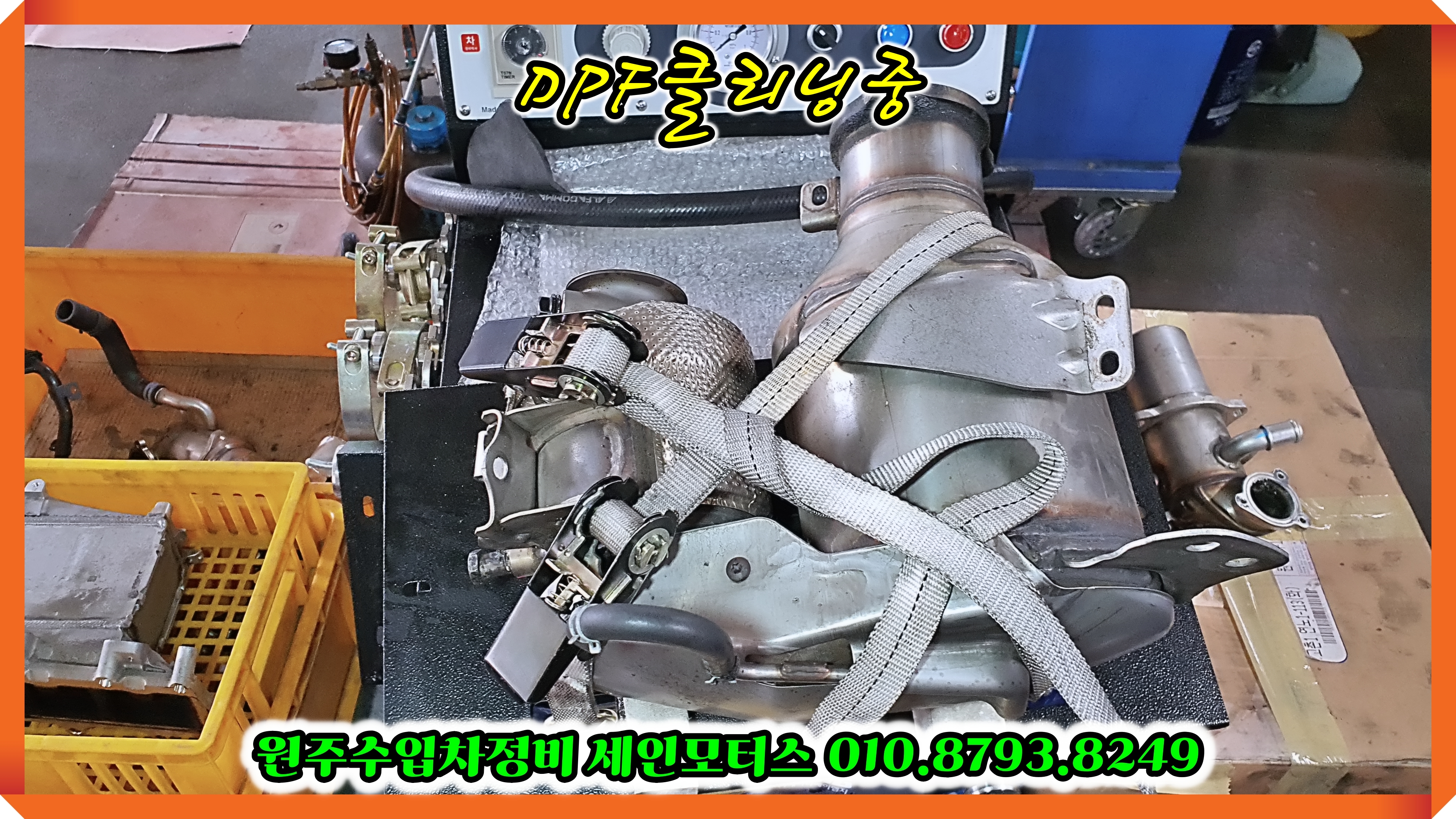 DPF 클리닝 장비에 포박을 하고 클리닝 중입니다.