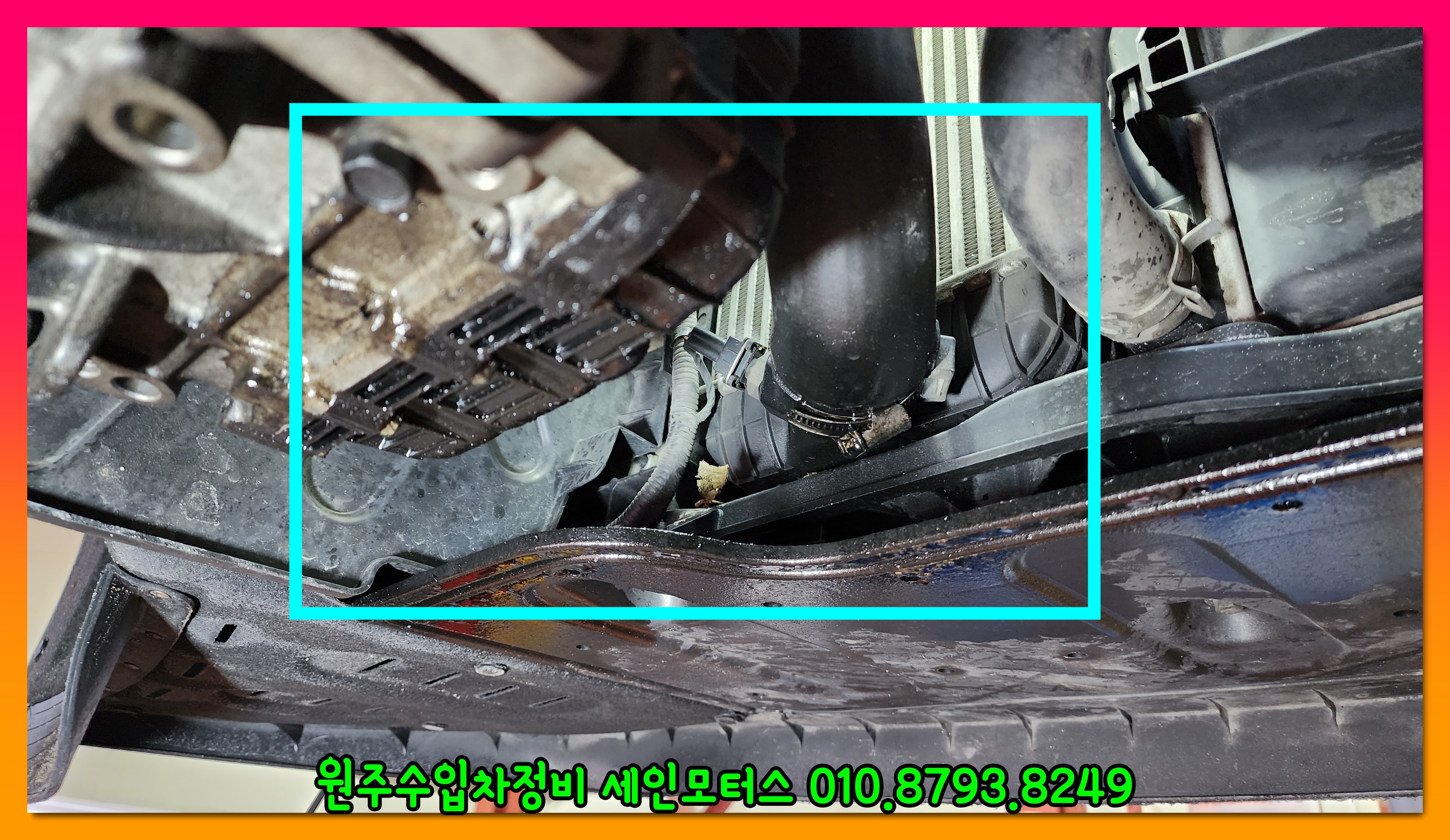 엔진 하부쪽에는 인터쿨러에서 엔진오일이 심하게 누유가 되고 있다.
