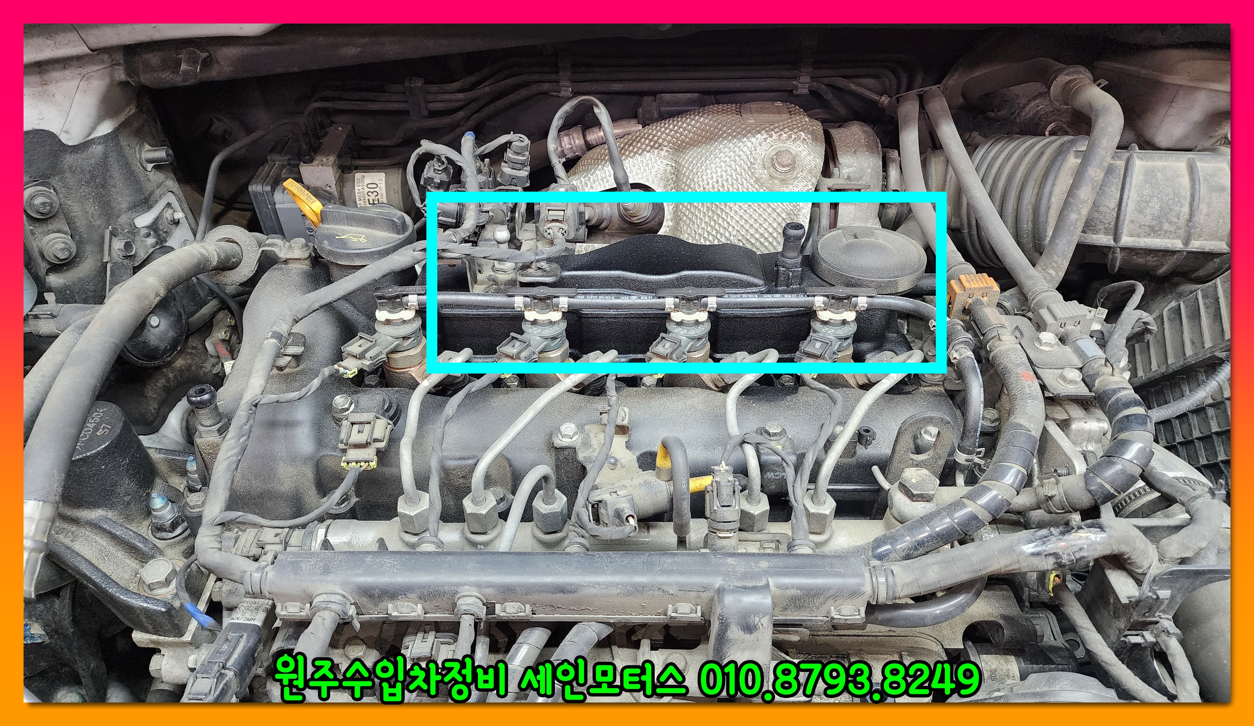 터보에서 누유된 오일이 주변으로 뿌려지면서 마치 엔진오일이 누유된 것 처럼 보인다.