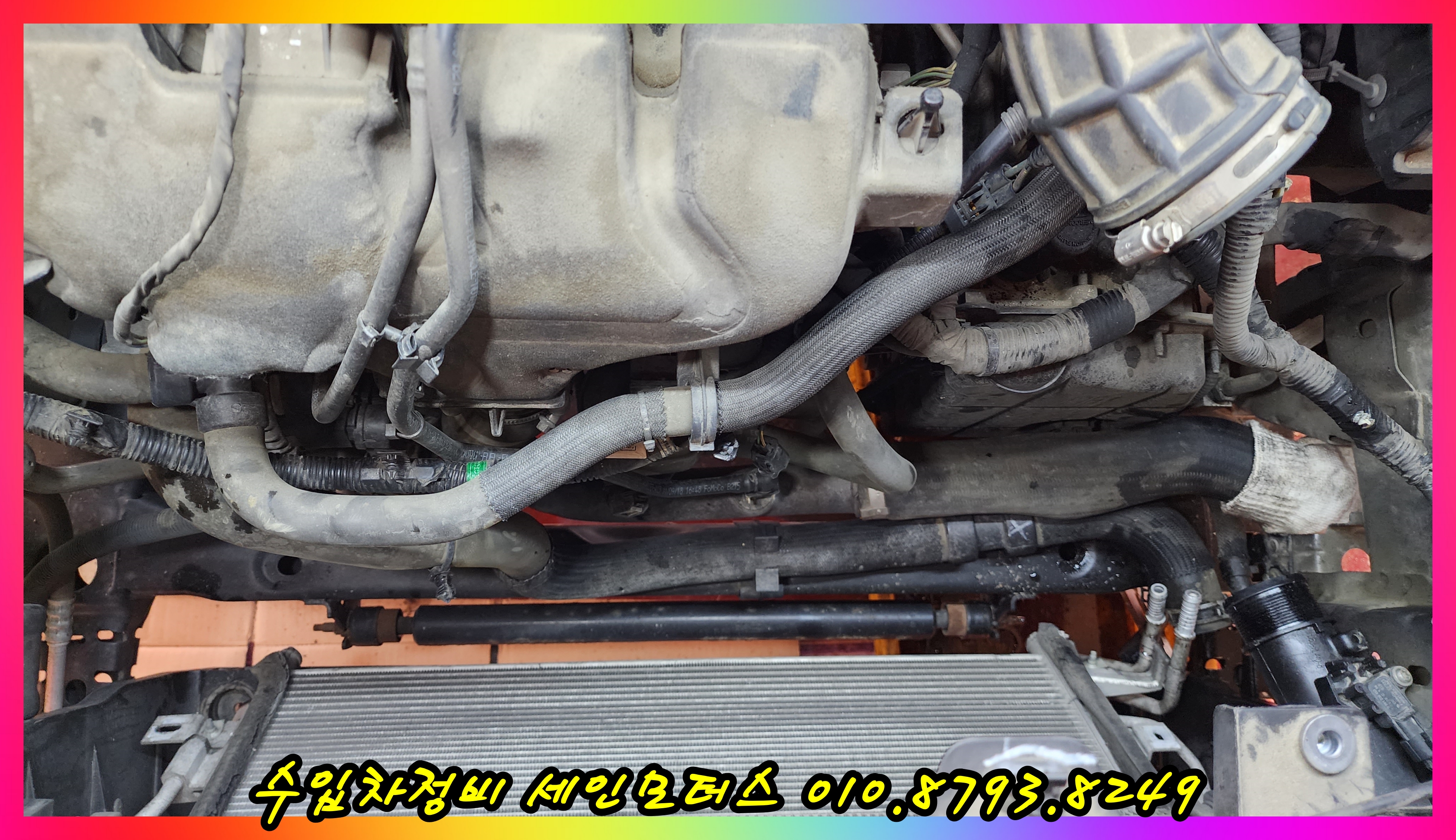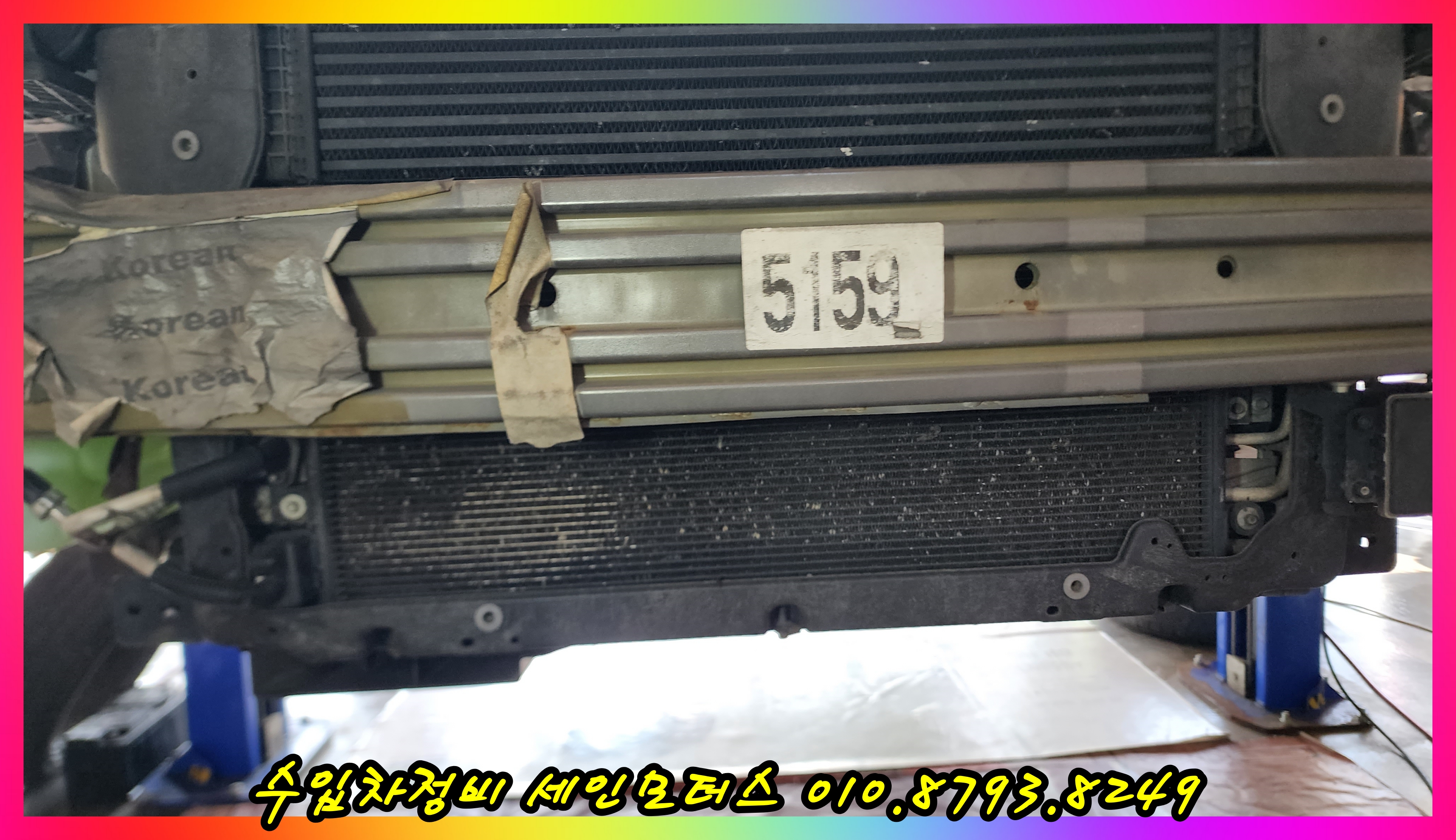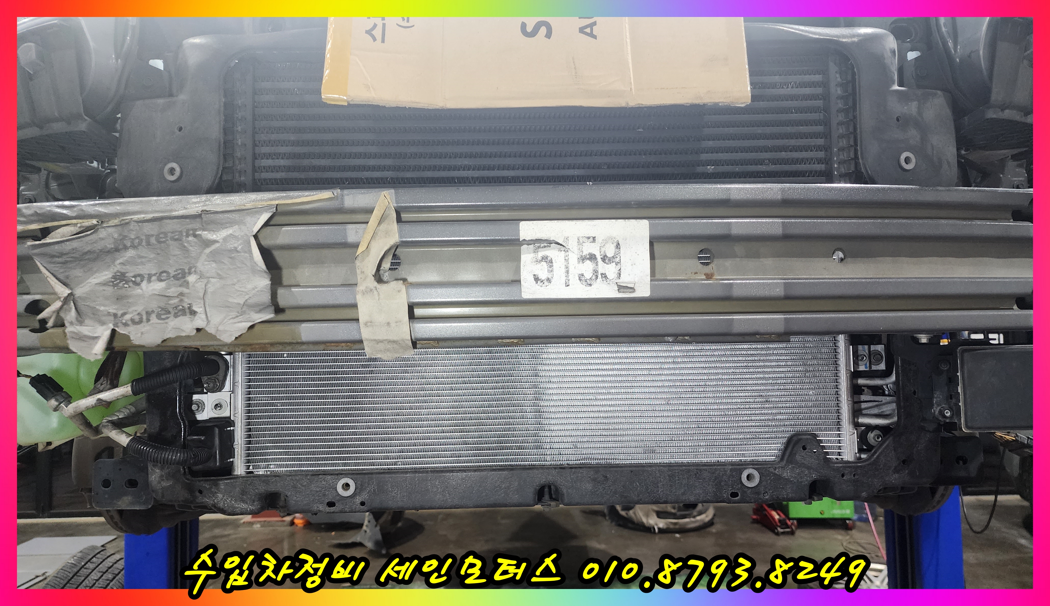 라디에이터를 탈거한 상태에서 에어컨 콘덴서를 교환한 모습이다.