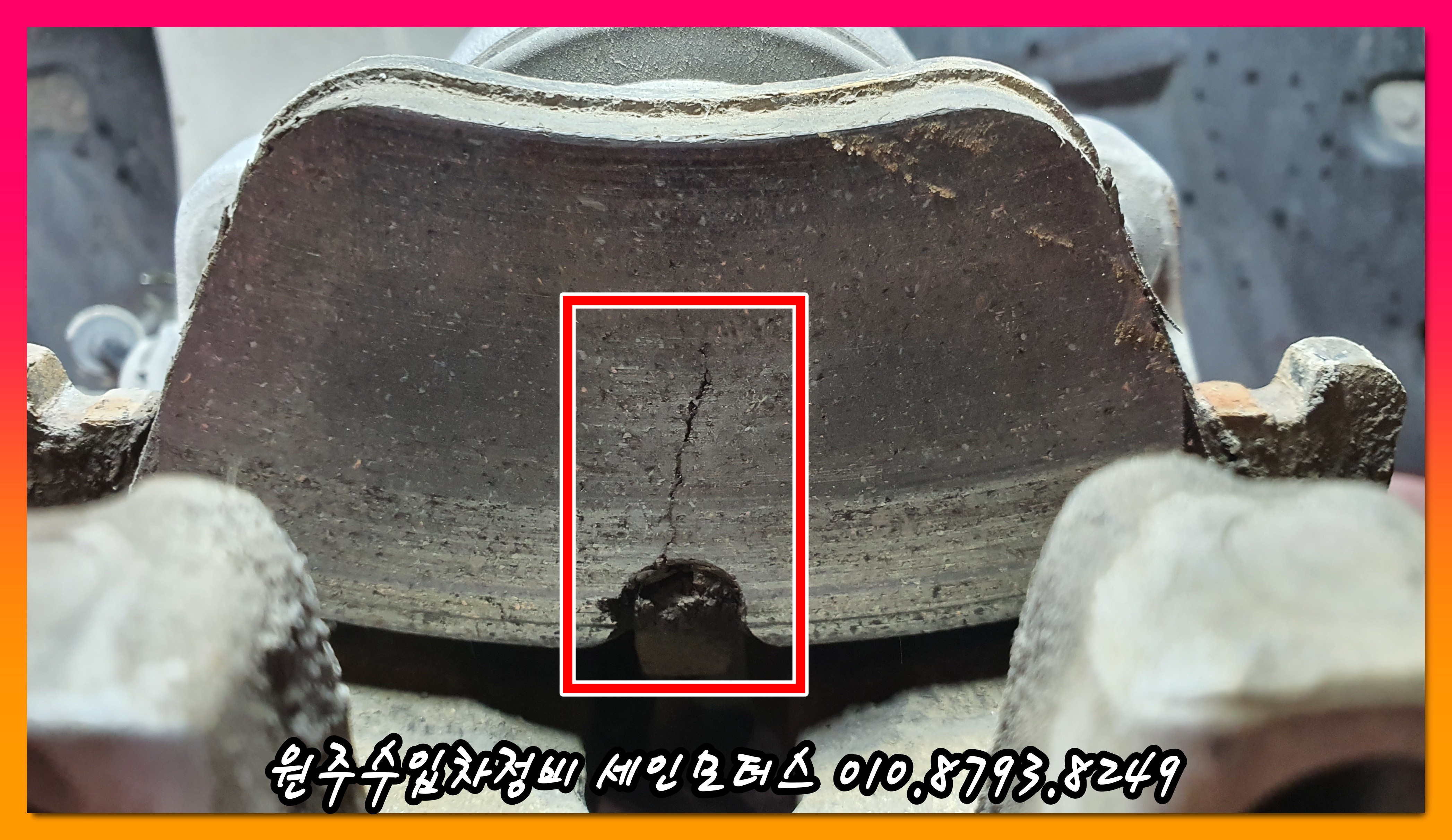 사진에 표시된 것처럼 크랙이 발생한 패드는 운행 중에 패드면 전체가 떨어져 나가는 경우도 발생한다.