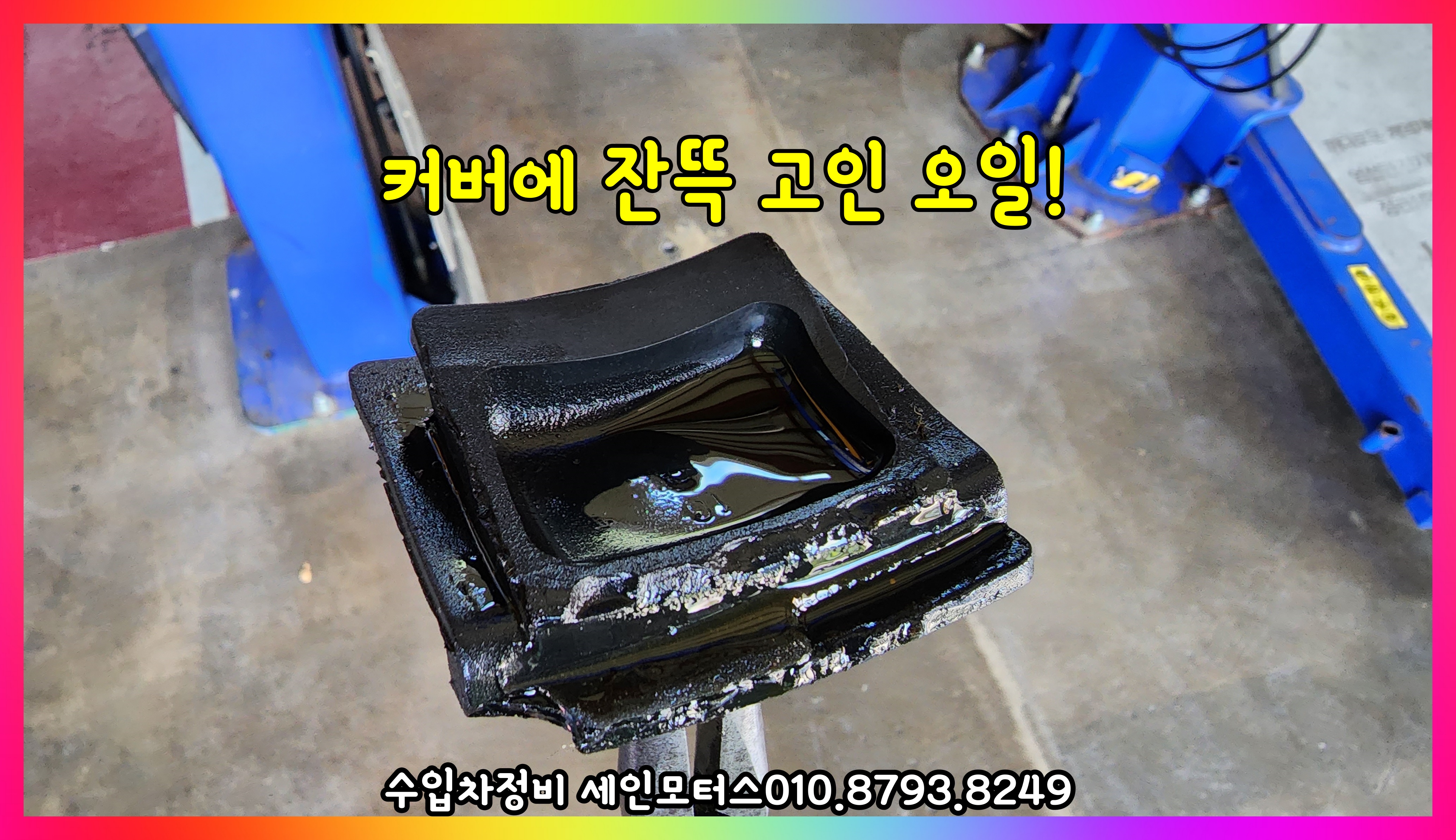 차량을 리프팅 해 보니 엔진오일인지 미션오일인지 알 수 없는 부분에서 누유가 심하게 되고 있었고 시동을 걸어 놓으면 이상한 소음도 들린다.
